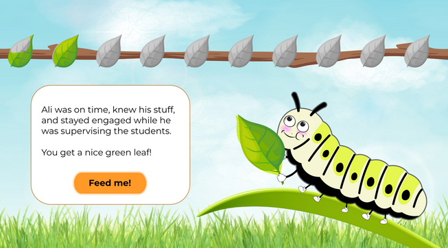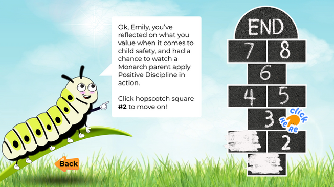 As a volunteer Supervisor, it's hard to know what exactly what the current Safety Guidelines at Monarch Community School are, let alone enforce them in a way that aligns with the school's Positive Discipline philosophy. This 8-module course uses scenarios and gamification to build confidence in learners' knowledge and skills so they can effectively identify and intervene in out-of-bounds schoolyard behavior. With each successful task, learners earn leaves to feed a monarch caterpillar. By the end of the course, it metamorphoses into a butterfly!